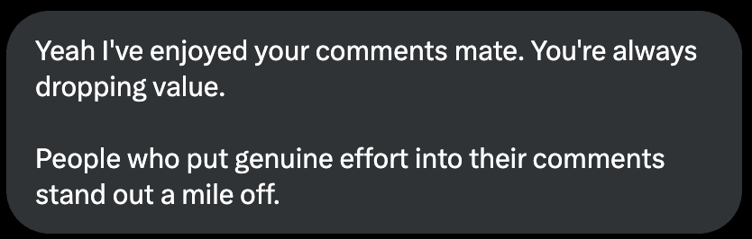 They add absolutely zero value whatsoever. And it's time to fix that (comments that look ChatGPT drive me mad). Just to show my competence on this subject (and mildly inflate my ego), here are some of my "testimonials": And these compliments that mildly inflate my ego aren't the only results. My comments have allowed me to: