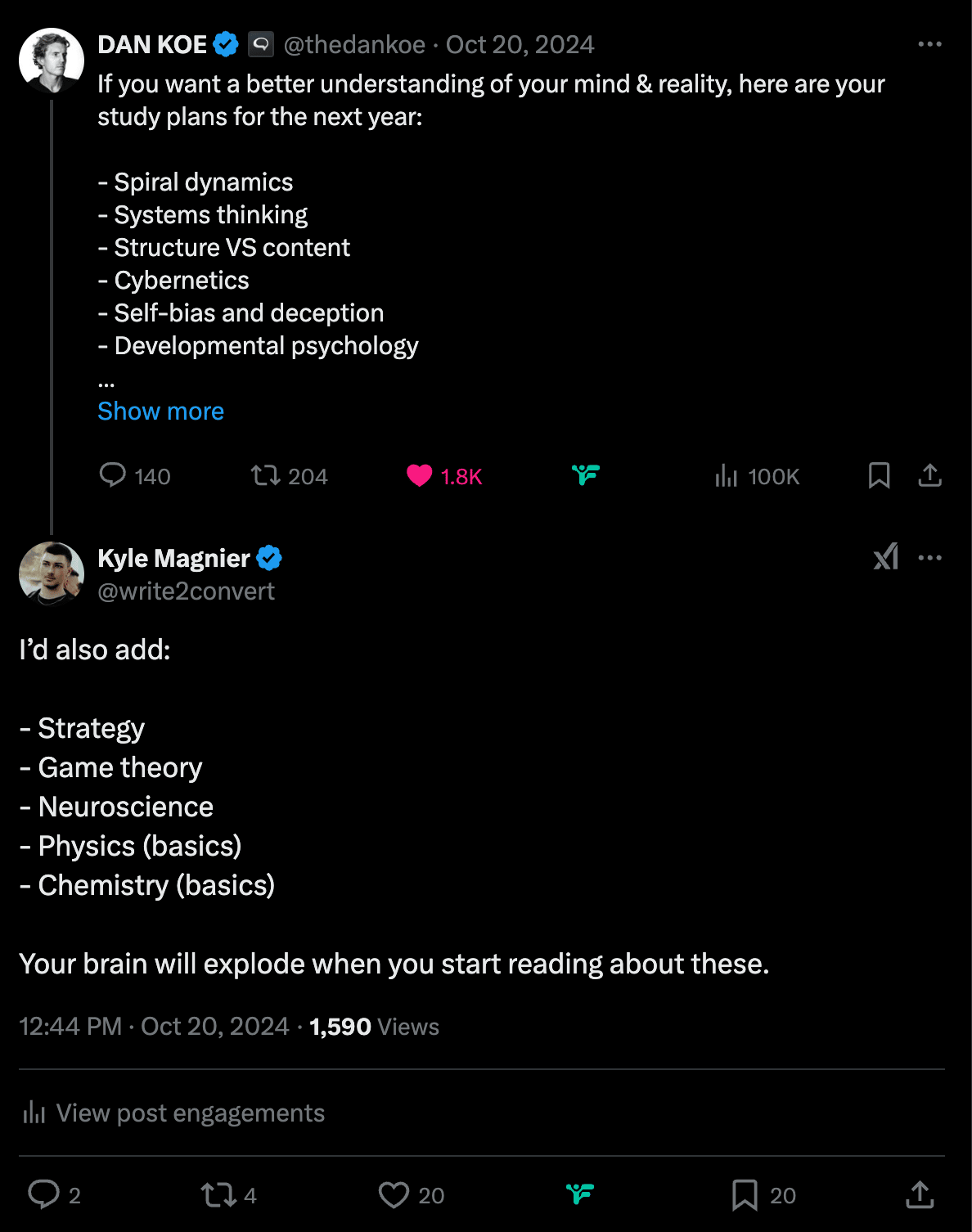 Best part is, the way I write comments is much more fun and a helluva lot easier. While some people grind and battle their brain to force out 30 comments a day, you'll be effortlessly pumping out 60 comments a day in the same amount of time without breaking a sweat (and get much better results). Anyway, let's go over some things to keep in mind when leaving comments: Add value - Do NOT rephrase the original tweet. You need to add to what the creator is saying. Think of it as the "yes and…" technique used in improv. There are 2 main types of value when it comes to commenting (at least 2 main types that I personally like to use): 1) Education 2) Entertainment When someone says something to you, reply with "yes, and…" – then build on top of what they're saying. Here's an example of adding value: You see, I didn't repeat what Dan said. I gave another perspective. Another method of achieving the same goal he wants others to achieve (unfucking their life in this case). And the reply did pretty well. One of the most-liked replies under that post (yep, my ego just keeps going up as I write this). Adding value can be as simple as giving a new perspective like what I did above. And if it's a list of the "top 10" whatever (or any kind of list), then add more that isn't already on the list. I'll give you an example: Another one under Mr. Koe's post. And yet again you can see it did pretty well (with the likes and favourites being a 1:1 ratio – meaning people found great value in it). You'll also notice people retweeting it, meaning you get put in front of even more people (and it means what you're saying is very valuable if people are willing to share it with their own audience). And like I said, "Value" comes in many different forms (we'll be sticking to 2 for the sake of this newsletter and its length). It doesn't need to be all about education. A great way to build a connection, especially with the creator of the tweet, is by using entertainment like humour, drama, irony, etc. (I might make a list of different ways to entertain in the future). Anyway, here's an example: It didn't do amazing in terms of engagement, but it clearly had a positive emotional impact on Dakota. That leads to connections and better relationships. Plus, others might find it funny and follow you solely because of that. "But Kyle, I'm not a funny guy!" You don't need to be. Hell, I never thought I was funny when I was commenting. But what you do need to be is careless. Not careless as in "drink 'n drive" careless, but careless as in "I'm gonna say what's on my mind and I don't give a fuck what you think of it" careless. Big difference. Okay before I wrap this up, I want to tell you one of the best pieces of advice I got that took my commenting game from zero to hero. And it was told to me by my fellow pineapple pizza lover, Dakota Robertson. When I first met Dakota, we were at a business event in Marbella, Spain (this was the same event I co-created by doing the entire funnel and email marketing for). I said to him "Yo! Dakota, fuckin love your content man" like a proper fanboy. "Hahaha thanks, yeah it's very autistic!" was his response. And after some talk about Twitter, ghostwriting, and why Kindle is far superior than physical books – he credited his "autistic" and "weird" side to his some of his success. Now, it's not because he was autistically charming (though that probably played a role), it was more because people could relate to him. He isn't super formal. He isn't corporate. He isn't the typical LinkedIn business persona that asks everyone if they "wAnT tO coNnEct?" No one relates with anyone that's super formal and talks like a corporate professional. So the advice he gave me was… "Be weird." Now, let me be clear: This does NOT mean be Jeffery Dahmer weird. This is about being fun and quirky weird. When I first heard him say "Be weird," I immediately translated it to: "Be yourself and say whatever you want and don't worry about any judgement. If they don't like what you say, they're not your audience so they don't matter. But if they like you, then you'll attract and nurture them and won't have to worry about losing them since it's your real personality they like, not a fake one." And that is exactly what commenting is all about: being yourself. Be super authentic. No filters, no edits, no polishing. Just comment the first thing then that comes to mind before you start overthinking. And then mix it with value (education or entertainment). Oh, and one more thing: If you don't know what to say, don't comment anything. You want all your comments to be natural. Not forced. If you need to force it, skip it and move to the next tweet to comment on. This not only makes all your comments good, but it also gives you peace of mind knowing you don't need to force comments. Anyways, that's all for today. Thank you for reading! – Kyle P.S. – If you're struggling to get clients through Twitter DMs, my next email will be all about how to send proper DMs that will make you stand out like a sore thumb in everyone's inbox. Stay tuned. |